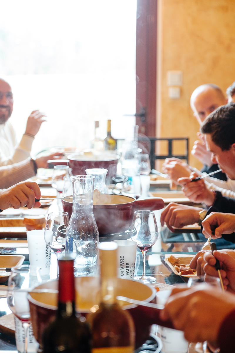 On t’a déjà dit qu’on s’occupait de tout ? Et bien figure-toi que oui, on s’occupe de tout. Ça fait une éternité qu’on prépare les planchettes de charcuteries avec notre petite trancheuse, avec les quelques fromages du coin et un bon pain frais. Au fil des saisons on gère la déco différemment, un coup avec les tomates cerises du moment, un coup avec quelques pommes finement coupées (Silviu est clairement le meilleur d’entre nous pour ça), bref on y met plein d’amour. Et à force d’événements sur les fondues, comme par exemple les fondues bissextiles, on s’est dit qu’il n’y avait mais aucune raison de ne pas en faire profiter les plus petits groupes qui nous demandaient ça en privatisant le caveau.